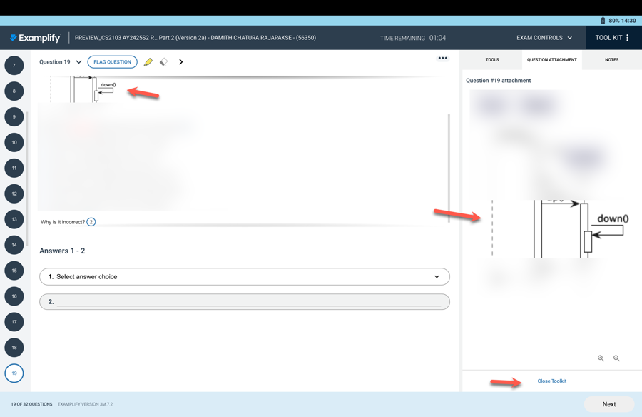 - Diagrams/images in some questions will be repeated as an attachment for some questions, so that you can see the top part and bottom part of the question side-by-side, rather than repeatedly scrolling up-and-down. You can close the attachment pane (using the