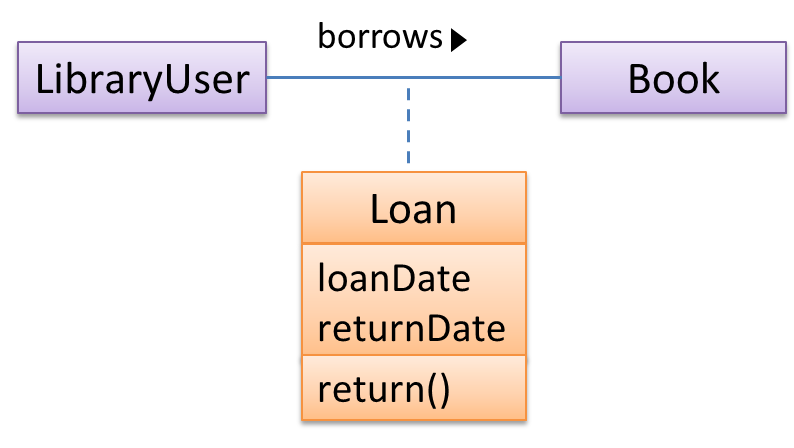In this example Loan is an association class because it stores information about the borrows association between the User and the Book.