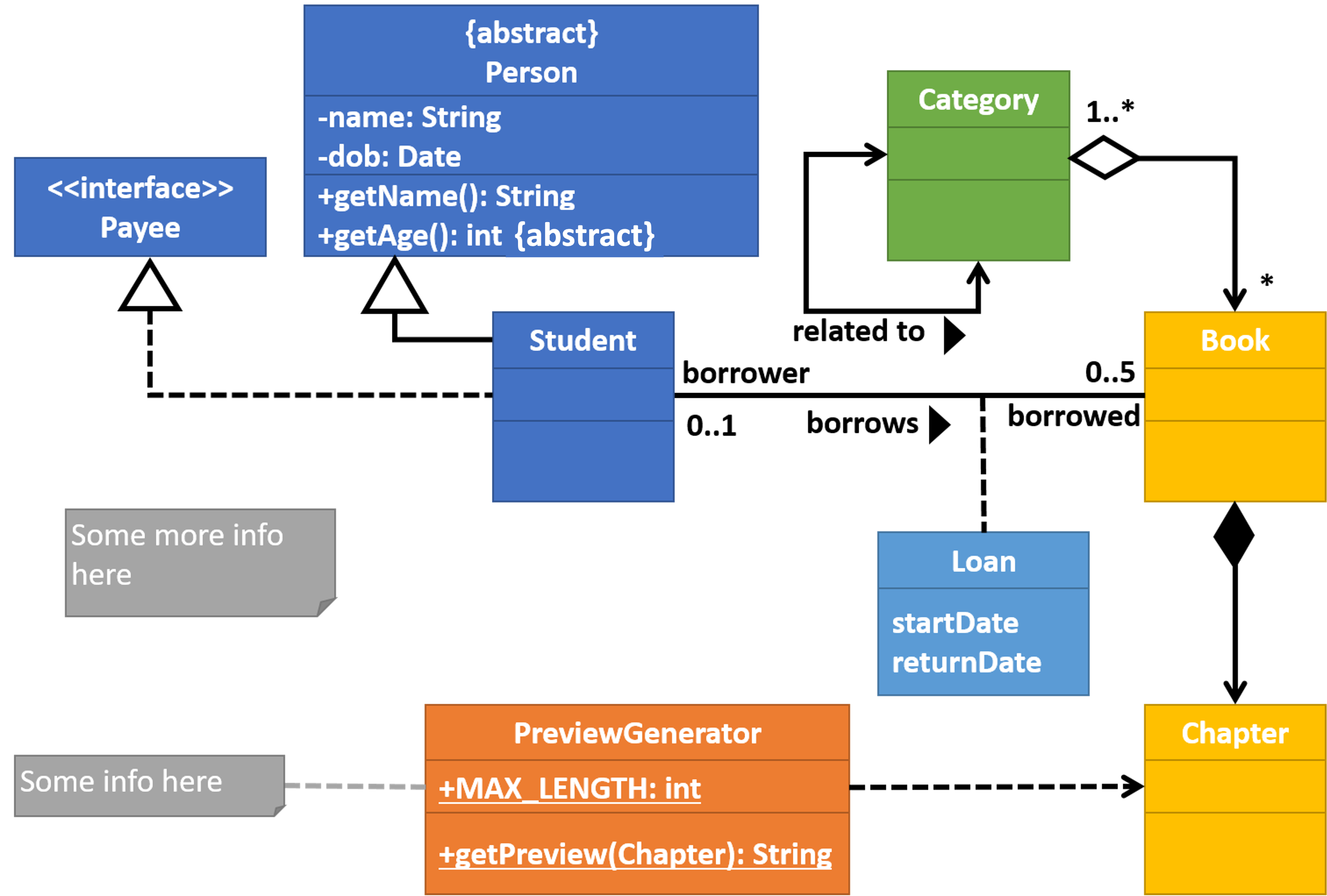 Explain the meaning of various class diagram notations in the following class diagram: