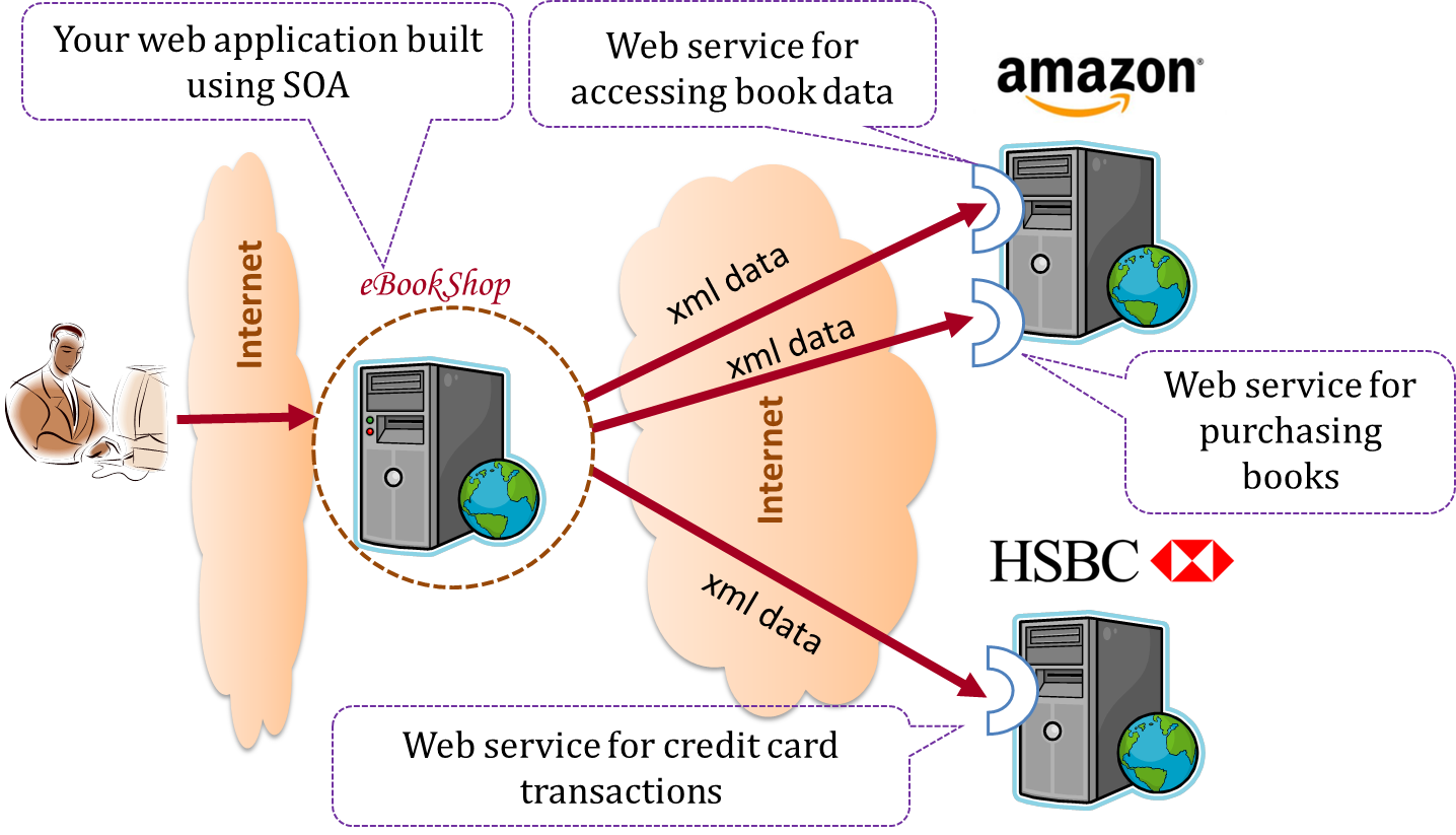 Suppose that Amazon.com provides a web service for customers to browse and buy merchandise, while HSBC provides a web service for merchants to charge HSBC credit cards. Using these web services, an ‘eBookShop’ web application can be developed that allows HSBC customers to buy merchandise from Amazon and pay for them using HSBC credit cards. Because both Amazon and HSBC services follow the SOA architecture, their web services can be reused by the web application, even if all three systems use different programming platforms.