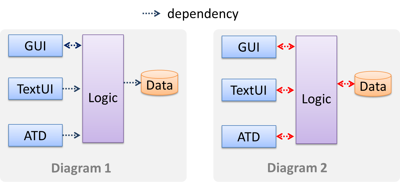 Consider the two architecture diagrams of the same software given below. Because Diagram 2 uses double-headed arrows, the important fact that GUI has a bidirectional dependency with the Logic component is no longer captured.
