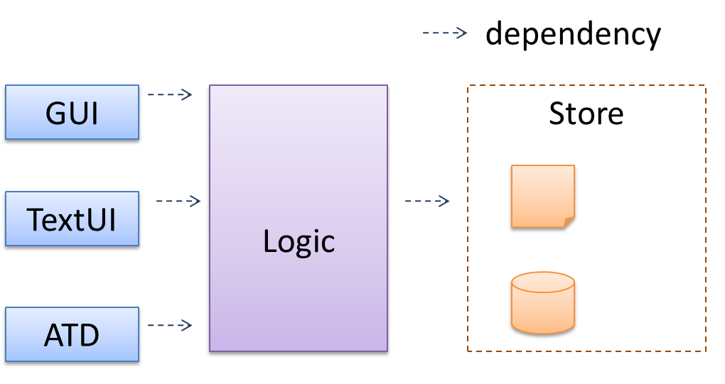 GUI: Graphical user interfaceTextUi: Textual user interfaceATD: An automated test driver used for testing the game logicLogic: Computation and logic of the gameStore: Storage and retrieval of game data (high scores etc.)The architecture is typically designed by the software architect, who provides the technical vision of the system and makes high-level (i.e., architecture-level) technical decisions about the project.