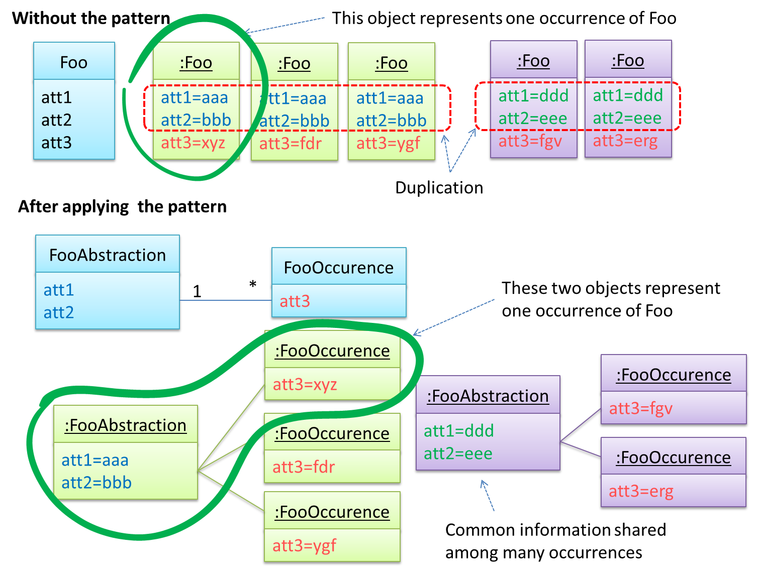 The <<Abstraction>> class should hold all common information, and the unique information should be kept by the <<Occurrence>> class. Note that ‘Abstraction’ and ‘Occurrence’ are not class names, but roles played by each class. Think of this diagram as a meta-model (i.e., a ‘model of a model’) of the BookTitle-BookCopy class diagram given above.