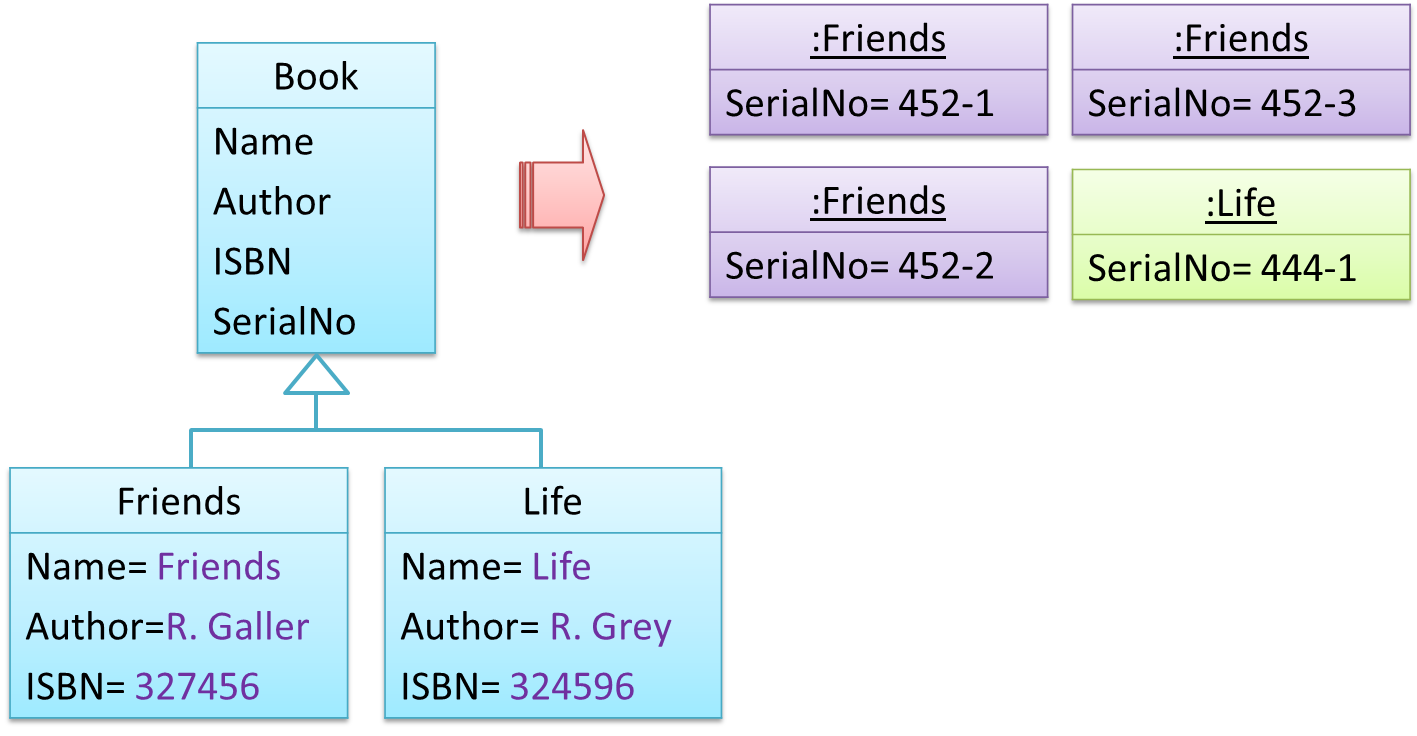 The design above segregates the common and unique information into a class hierarchy. Each book title is represented by a separate class with common data (i.e., Name, Author, ISBN) hard-coded in the class itself. This solution is problematic because each book title is represented as a class, resulting in thousands of classes (one for each title). Every time the library buys new books, the source code of the system will have to be updated with new classes.