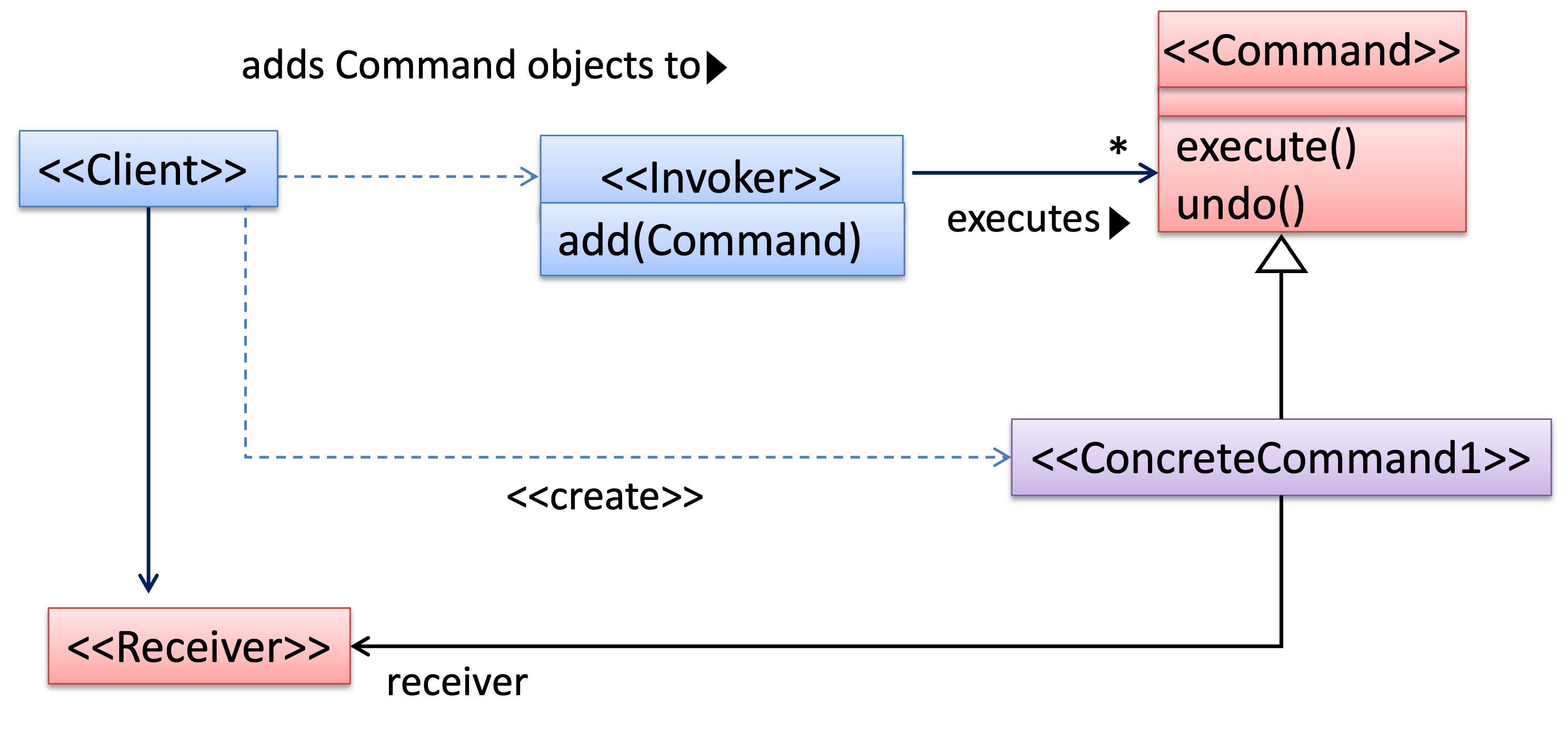 The <<Client>> creates a <<ConcreteCommand>> object, and passes it to the <<Invoker>>. The <<Invoker>> object treats all commands as a general <<Command>> type. <<Invoker>> issues a request by calling execute() on the command. If a command is undoable, <<ConcreteCommand>> will store the state for undoing the command prior to invoking execute(). In addition, the <<ConcreteCommand>> object may have to be linked to any <<Receiver>> of the command () before it is passed to the <<Invoker>>. Note that an application of the command pattern does not have to follow the structure given above.
