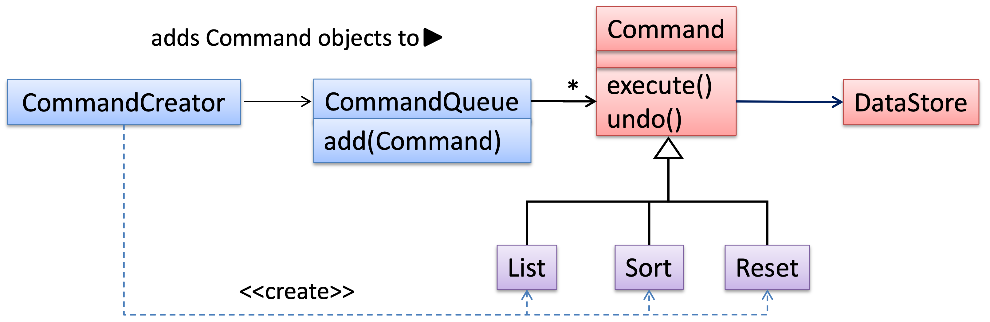 In the example solution below, the CommandCreator creates List, Sort, and Reset Command objects and adds them to the CommandQueue object. The CommandQueue object treats them all as Command objects and performs the execute/undo operation on each of them without knowledge of the specific Command type. When executed, each Command object will access the DataStore object to carry out its task. The Command class can also be an abstract class or an interface.