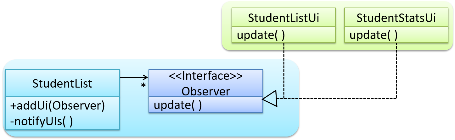 However, the StudentList object has no knowledge about StudentListUi and StudentStatsUi (note the direction of the navigability) and has no way to inform those objects. This is an example of the type of problem addressed by the Observer pattern.