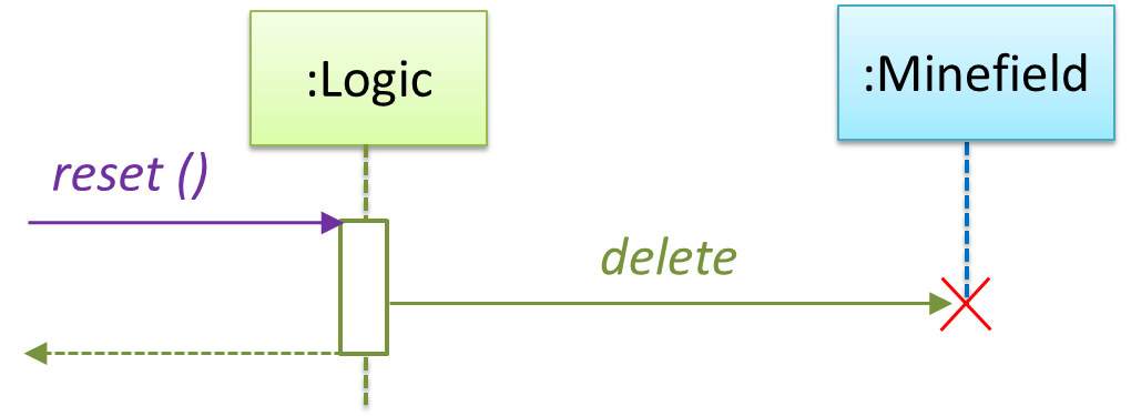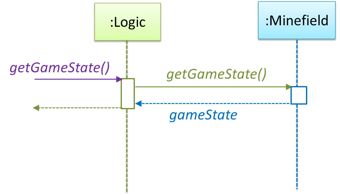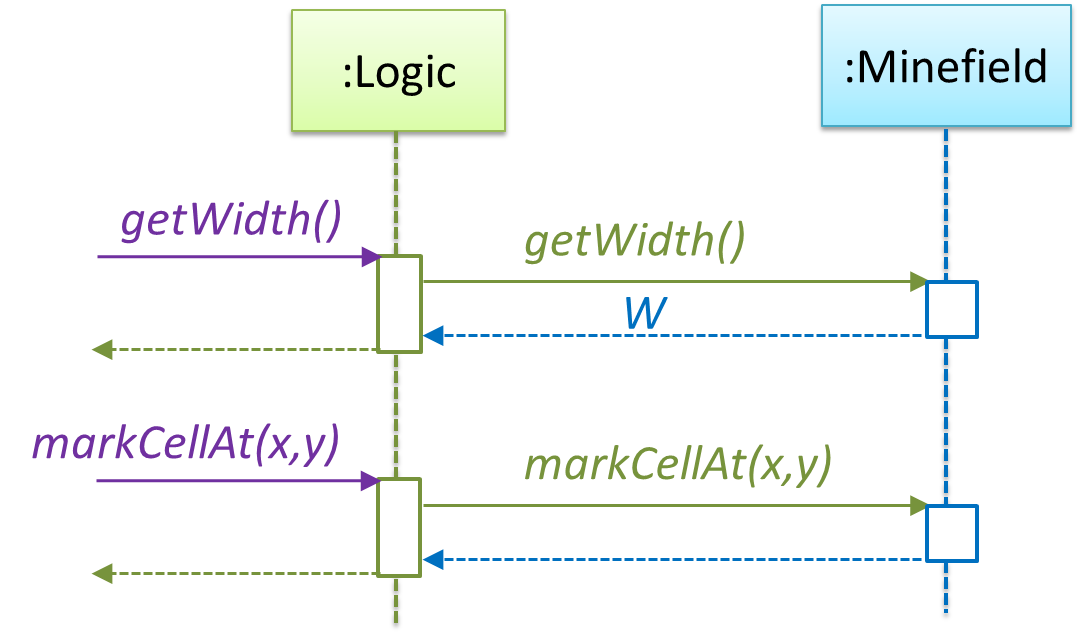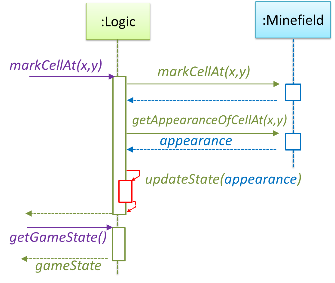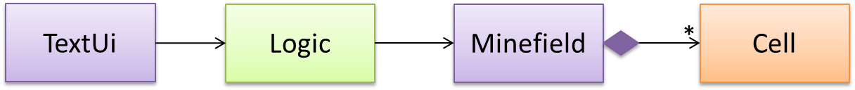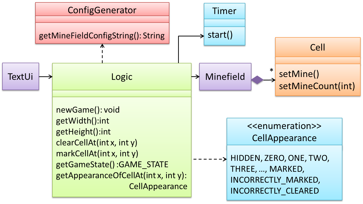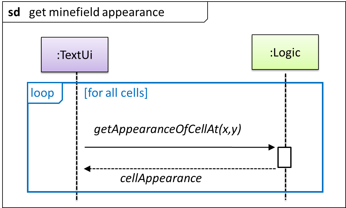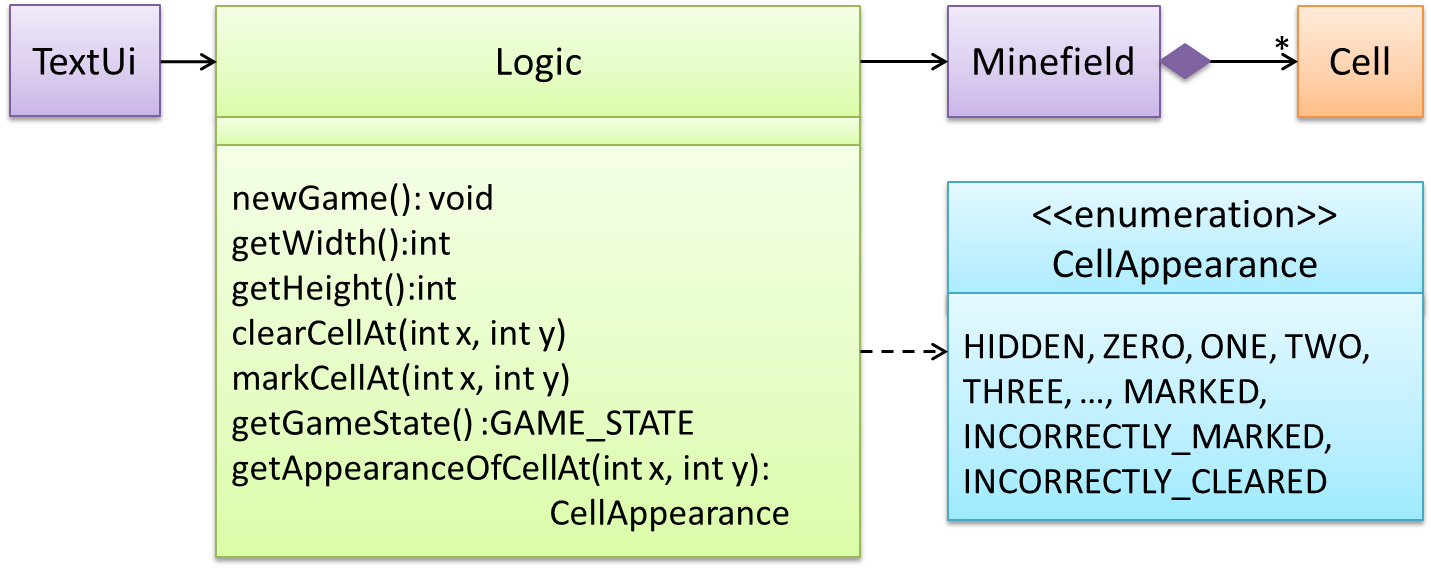 getAppearanceOfCellAt(int,int): CELL_APPEARANCE (CELL_APPEARANCE: HIDDEN, ZERO, ONE, TWO, THREE, …, MARKED, INCORRECTLY_MARKED, INCORRECTLY_CLEARED)In the above design, TextUi does not access Cell objects directly. Instead, it gets values of type CELL_APPEARANCE from Logic to be displayed as a minefield to the player. Alternatively, each cell or the entire minefield can be passed directly to TextUi.