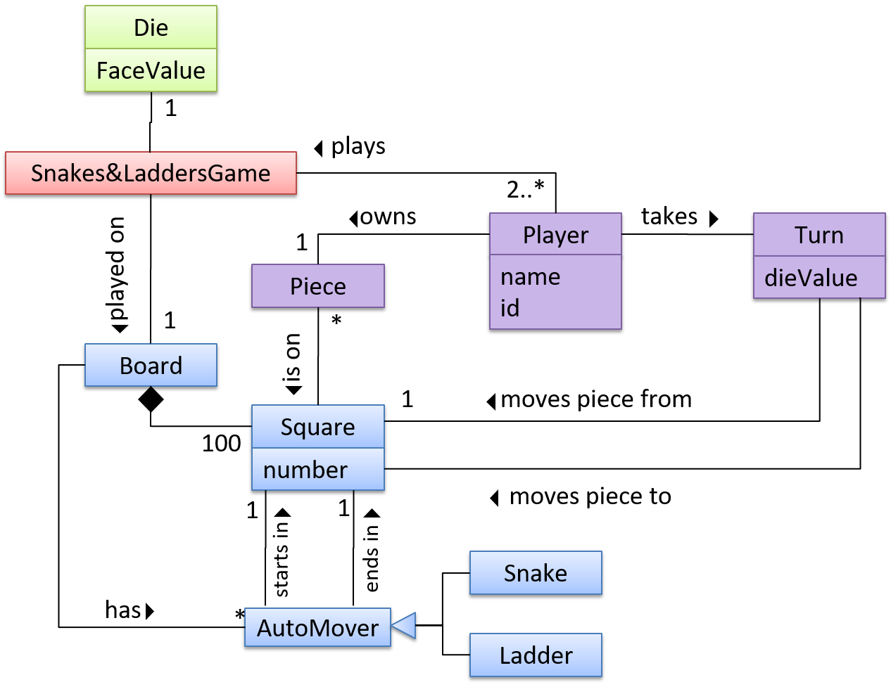 Description: The snakes and ladders game is played by two or more players using a board and a die. The board has 100 squares marked 1 to 100. Each player owns one piece. Players take turns to throw the die and advance their piece by the number of squares they earned from the die throw. The board has a number of snakes. If a player’s piece lands on a square with a snake head, the piece is automatically moved to the square containing the snake’s tail. Similarly, a piece can automatically move from a ladder foot to the ladder top. The player whose piece is the first to reach the 100th square wins.