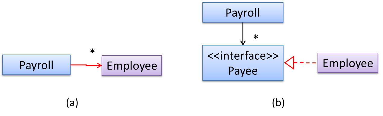 In design (a), the higher level class Payroll depends on the lower level class Employee, which is a violation of DIP. In design (b), both Payroll and Employee depend on the Payee interface (note that inheritance is a dependency).