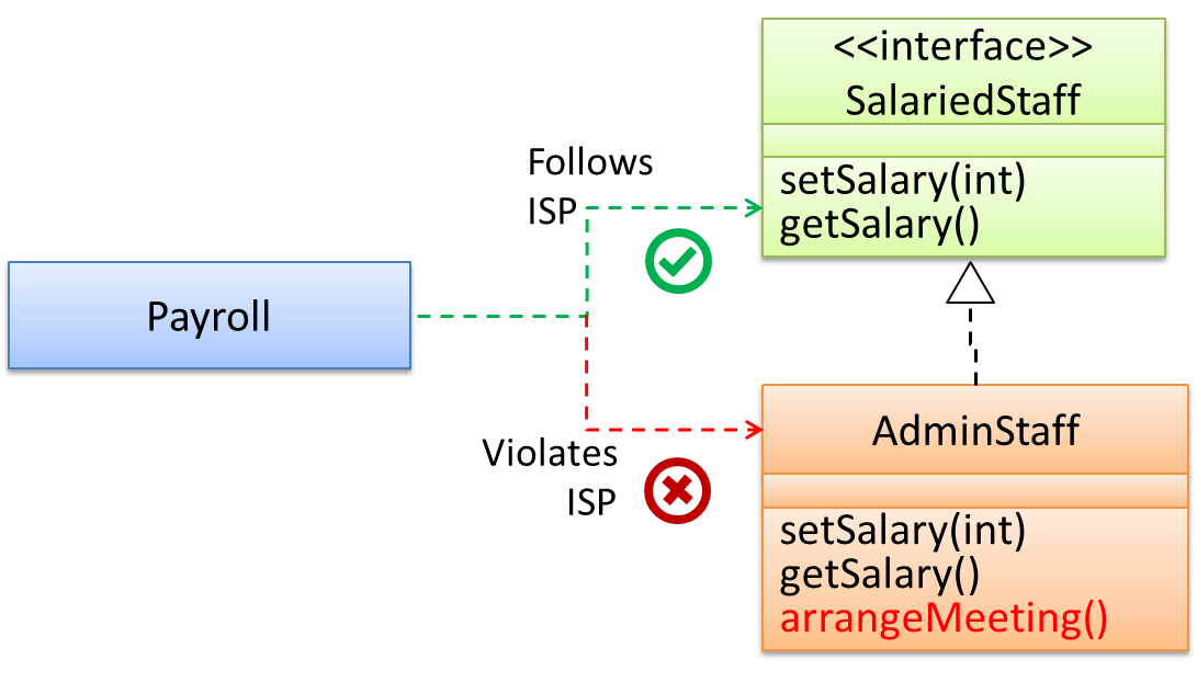 Admin class follows LSP because it fulfills Payroll’s expectation of Staff objects (i.e., it works for all positive values). Substituting Admin objects for Staff objects will not break the Payroll class functionality.Academic class violates LSP because it will not work for percent values over 100 as expected by the Payroll class. Substituting Academic objects for Staff objects can potentially break the Payroll class functionality.Another example