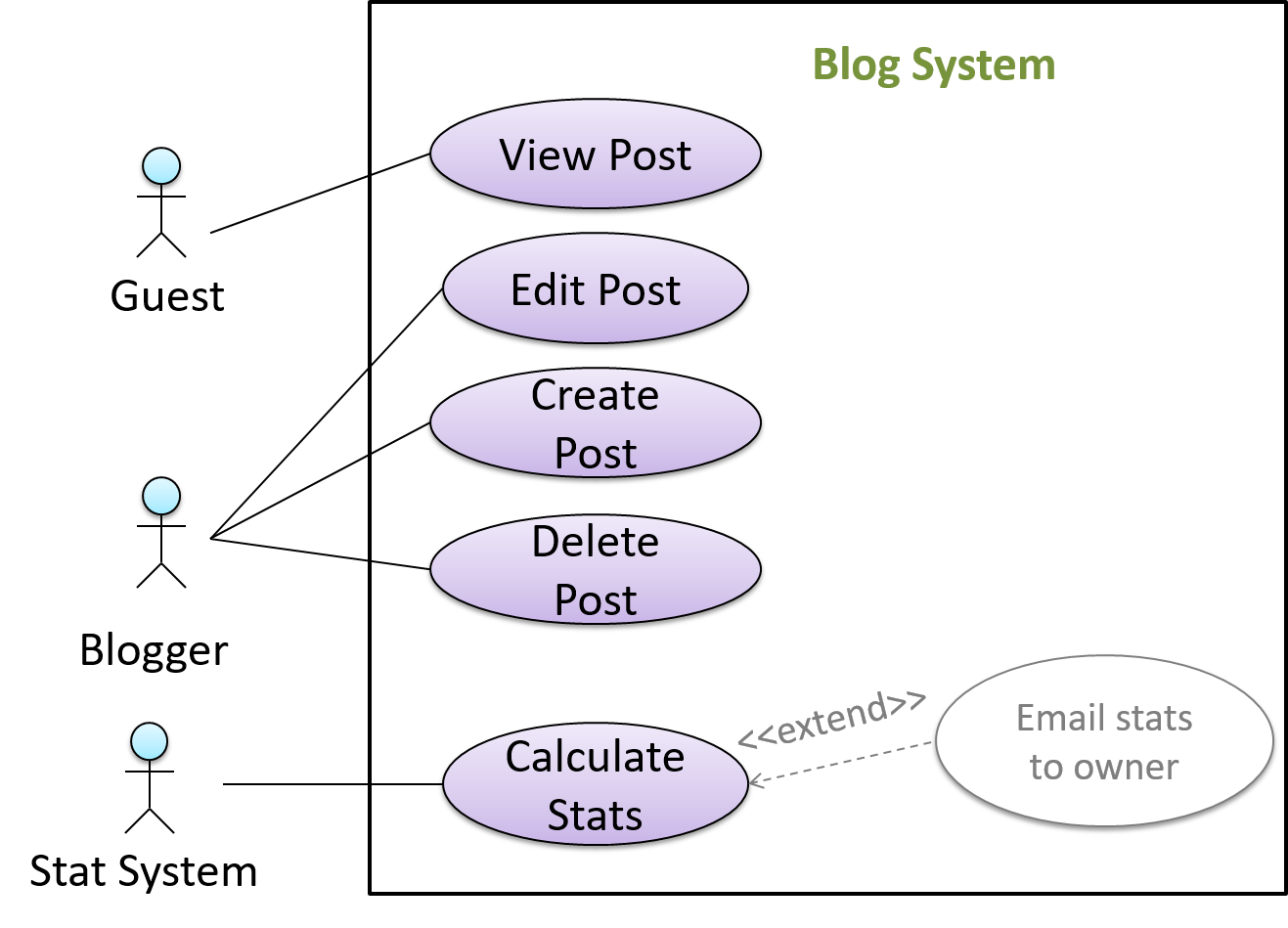 In this example, actor Blogger can do all the use cases the actor Guest can do, as a result of the actor generalization relationship given in the diagram.
