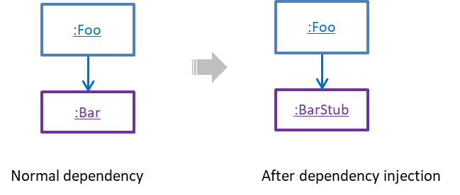 A Foo object normally depends on a Bar object, but you can inject a BarStub object so that the Foo object no longer depends on a Bar object. Now you can test the Foo object in isolation from the Bar object.