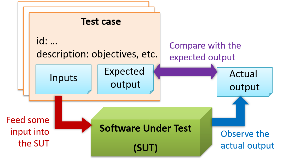 When testing, you execute a set of test cases. A test case specifies how to perform a test. At a minimum, it specifies the input to the software under test (SUT) and the expected behavior.